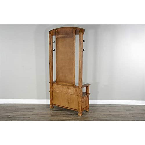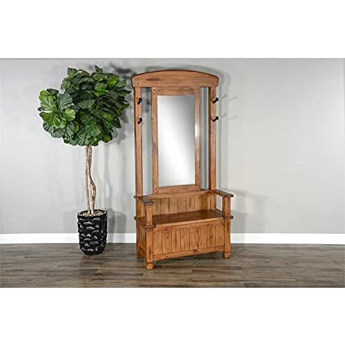 This hall tree has just what you need to keep your entryway, hallway, or mudroom clutter-free. It features four railroad spike metal hooks that easily hold your coats, leashes, or bags. And down below, one large storage bench that is great for holding your shoes. Features :- Materials: Wood- Finish: Rustic oak- Distressed mahogany/mindi solids and veneer. Railroad spike hangers- Storage under seat-  Product Dimensions : 78"H x 38"W x 17"D- Product Weight : 114 lbs