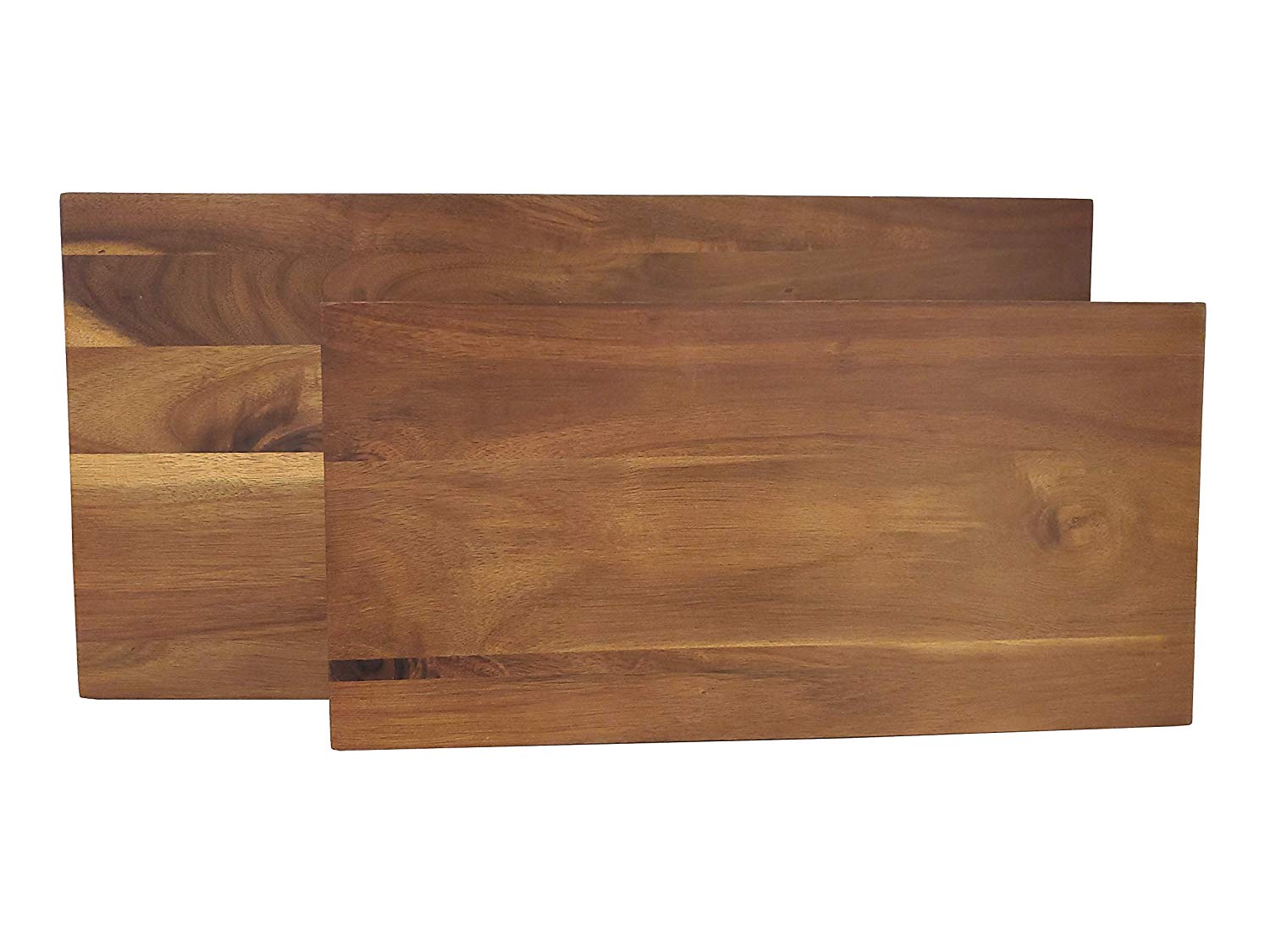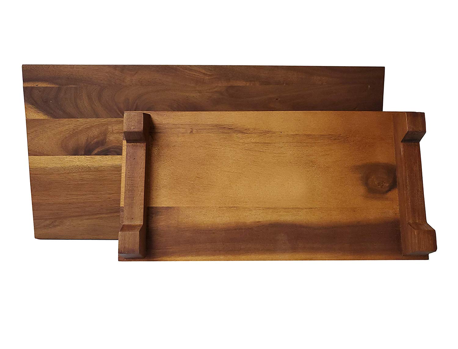 ALL NATURAL No synthetic materials here. Made from solid 100% natural Acacia wood and finished to enhanced it's natural grain. 100% food safe and perfect for cheeses, fruits, nuts, serving, chopping, slicing… the options are endless. UPGRADE YOUR FOOD Made for chopping, serving, or decor because, why not? It's just too pretty to not leave it out even when it's not being complimented with some cheese or fruit! EASY CARE Hand wash with soft sponge and warm soapy water immediately after use, hand dry, do not use abrasive cleaners, do not use steel wool, do not submerge in water. If you really love it, a little oil rubbed in the wood on occasion will bring out its beauty every time. WHAT'S IN THE BOX. Inside the box you'll find an all natural 100% Acacia hardwood footed rectangular cutting and serving board set of two measuring; Small- 15.75"x7.9"x 2"Thick and Large- 20"x10"x 2"Thick. THE PERFECT GIFT Know anyone that likes to cook or loves entertaining? This set is perfect for them. Boxed and ready to go for any occasion. Board, Wood, Platter, Tray, Chop, Natural Wood