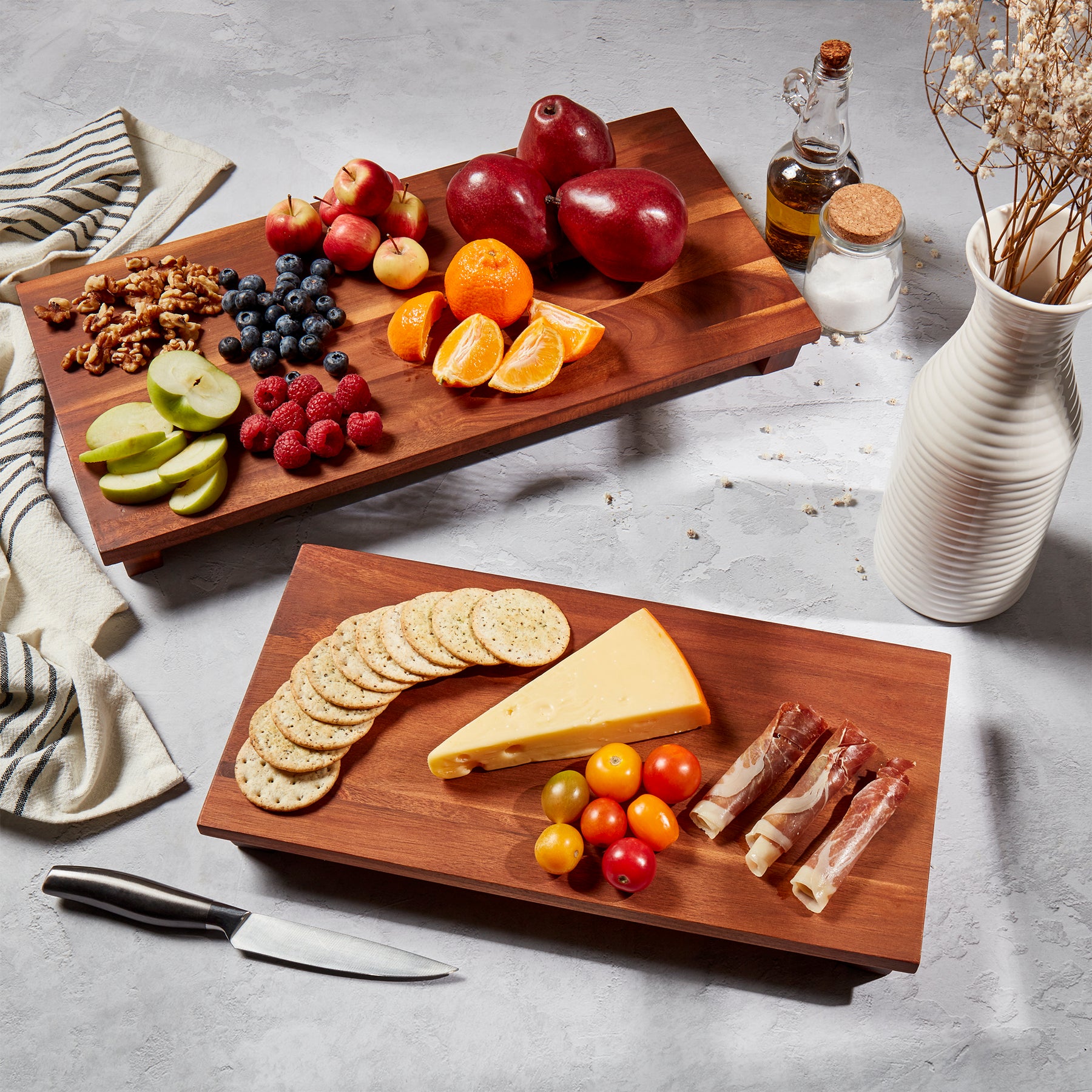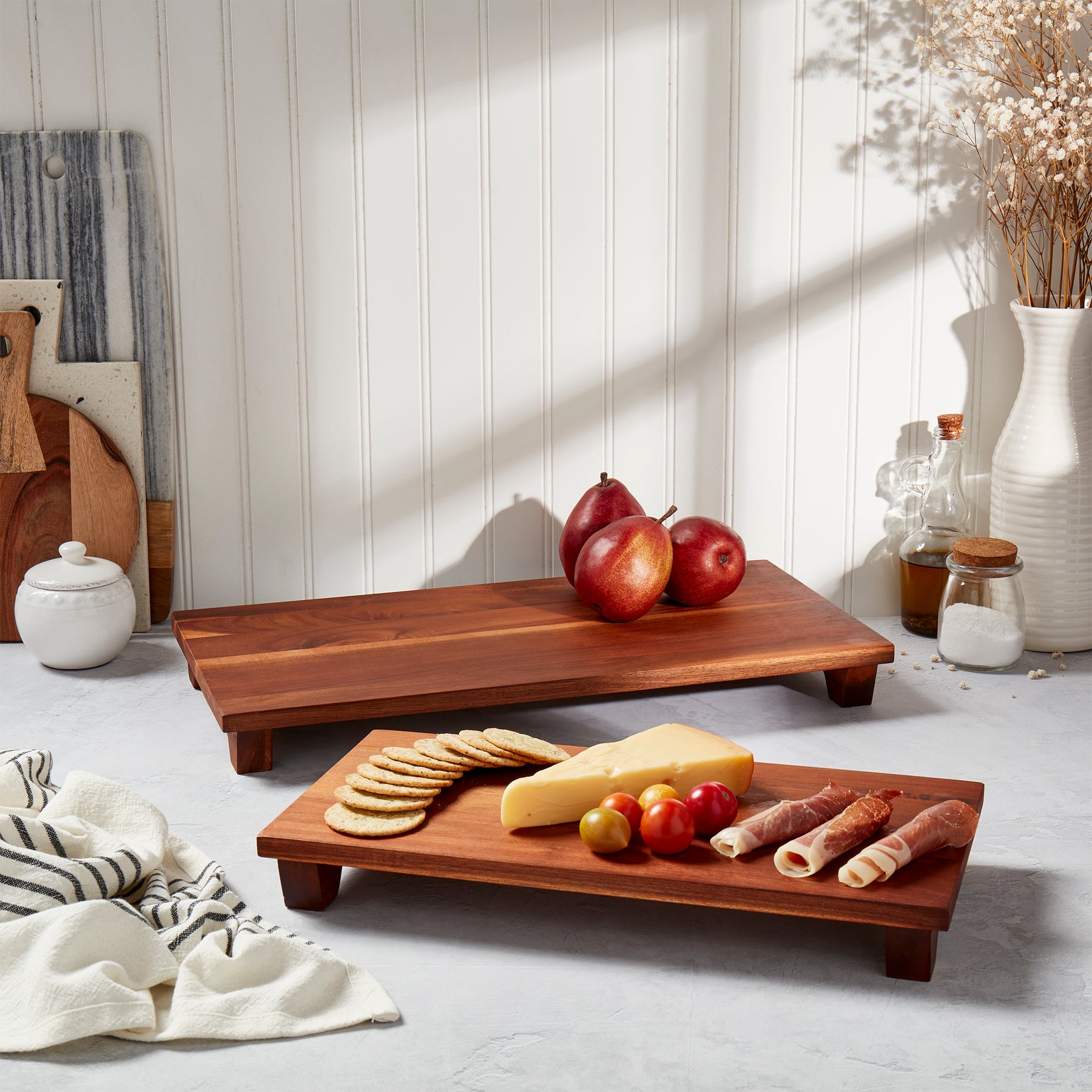 Artisanal Acacia Serving Collection- Footed Charcuterie/Cutting Board Set of 2