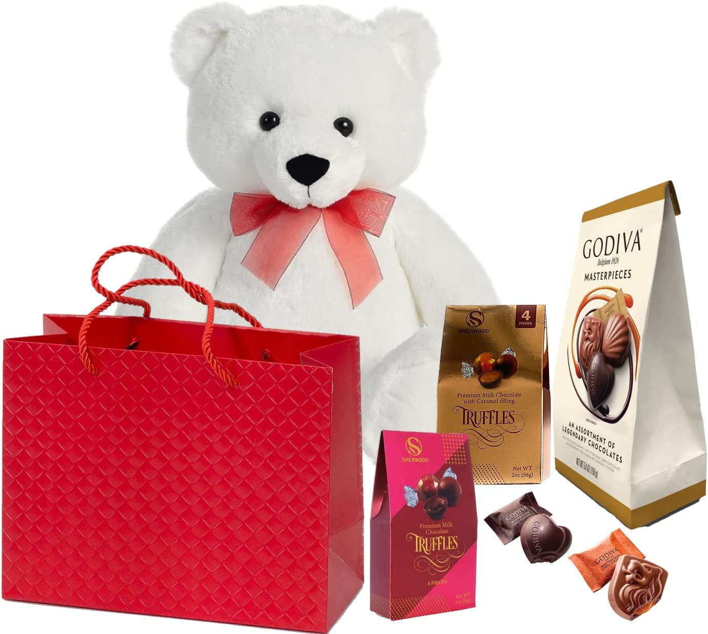 Valentines day Premium Gift Basket| 12 Plush Teddy Bear(Color may vary)| Godiva Masterpieces Chocolate| Truffles