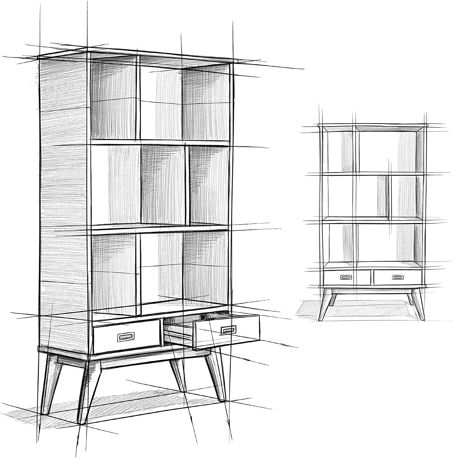 Mid Century Modern Bookcase, Solid Hardwood, Drawer and Shelves, Living Room, Study and Office