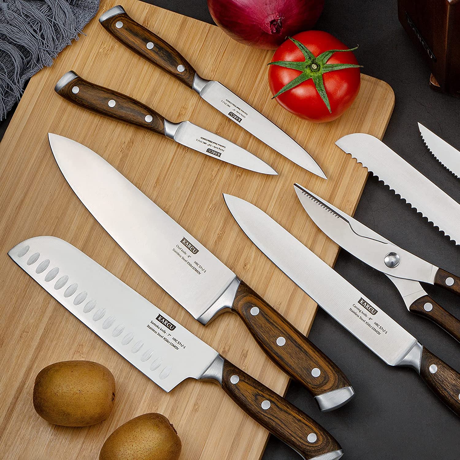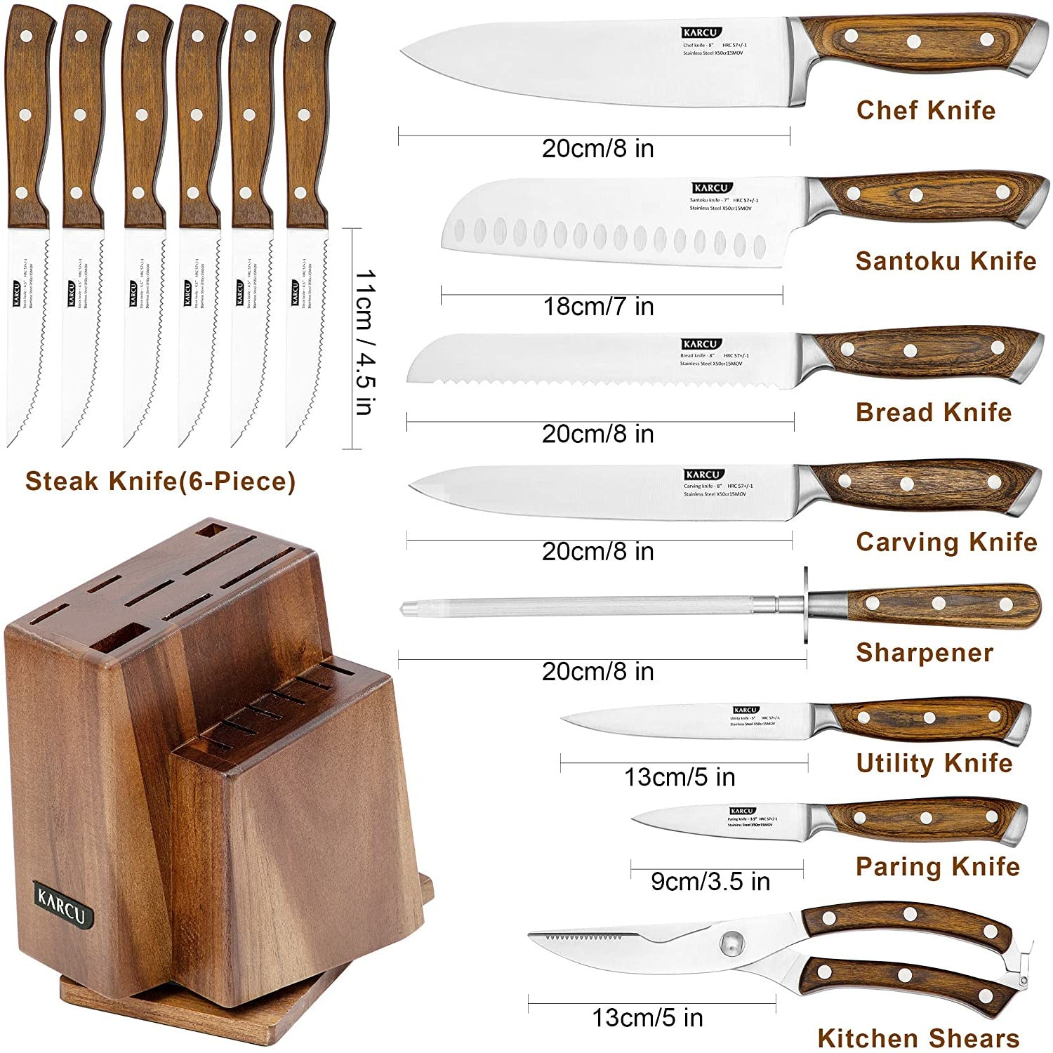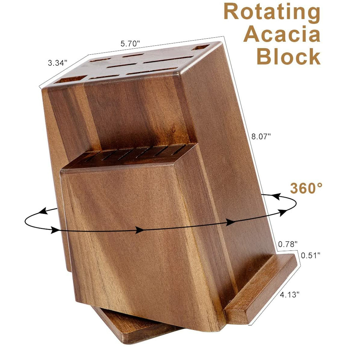- All knives store safely in the Acacia wood knife block for countertop space efficient storage. The rotating block can easily select the knife to be used, convenient and simple.