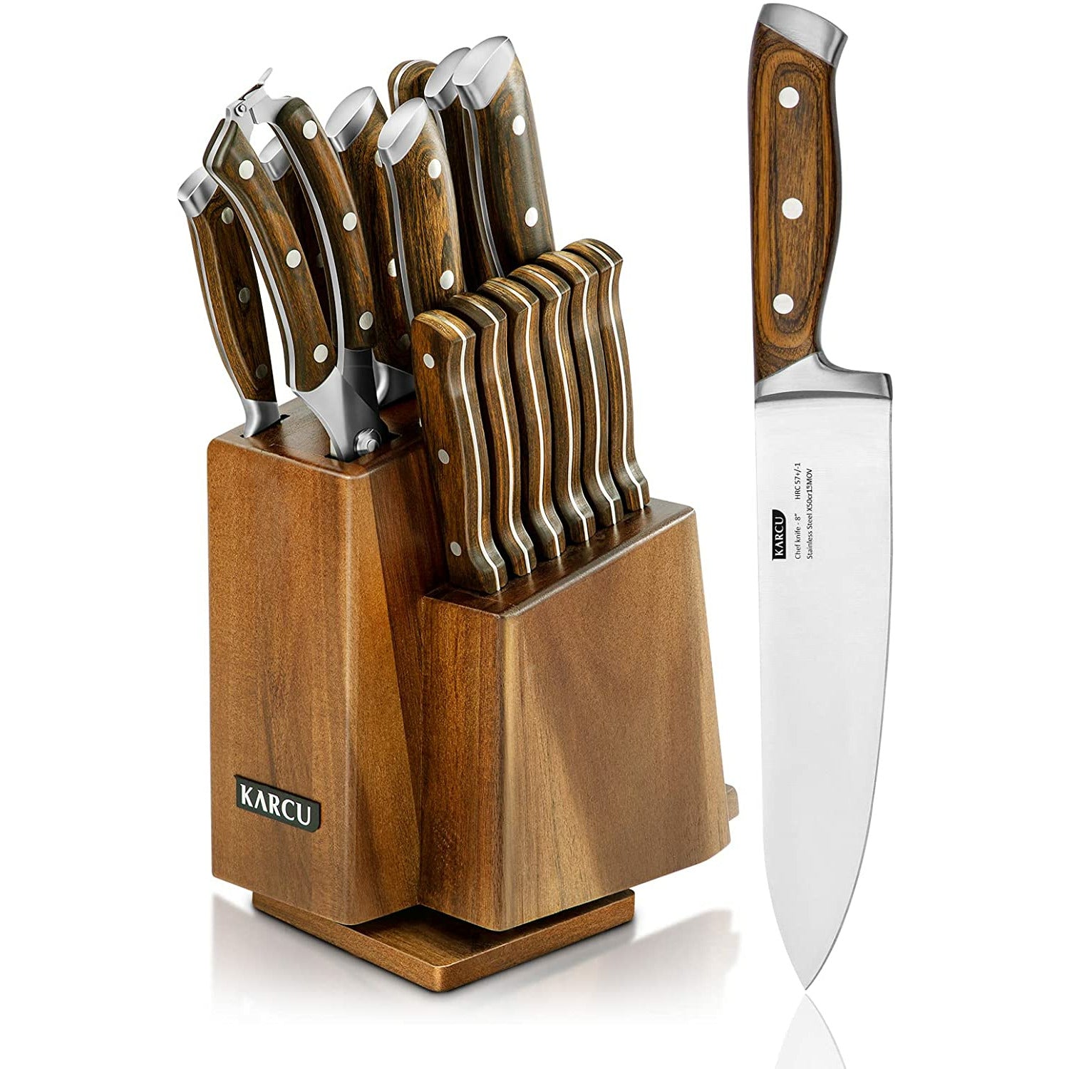 15-Piece German Steel Knife with Sharpener Set, Rotating Acacia Block