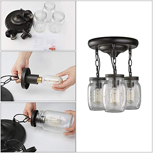 The glass jar ceiling light features a trio of clear, pint-size jars with a look of days gone by. It casts a soft glow when filled with vintage-style bulbs. Hung above tables, counters or in hallways, its lighthearted charm warms up any space. Model#: A02981 Material: Steel/Glass Finish: Dark Bronze Type: Ceiling light Style: Rustic/Loft Light Direction: Down Location: Dry Use Only Connection: Hardwired Certification: UL Listed Dimmable: N Bulb Type: LED/Incandescent Bulb Base: E-26 Bulb Wattage: 40W Number of Bulb: 3 Voltage: 120V Bulb Included: N Assembly Required: Y Mounting Accessory Included: Yes Notices: