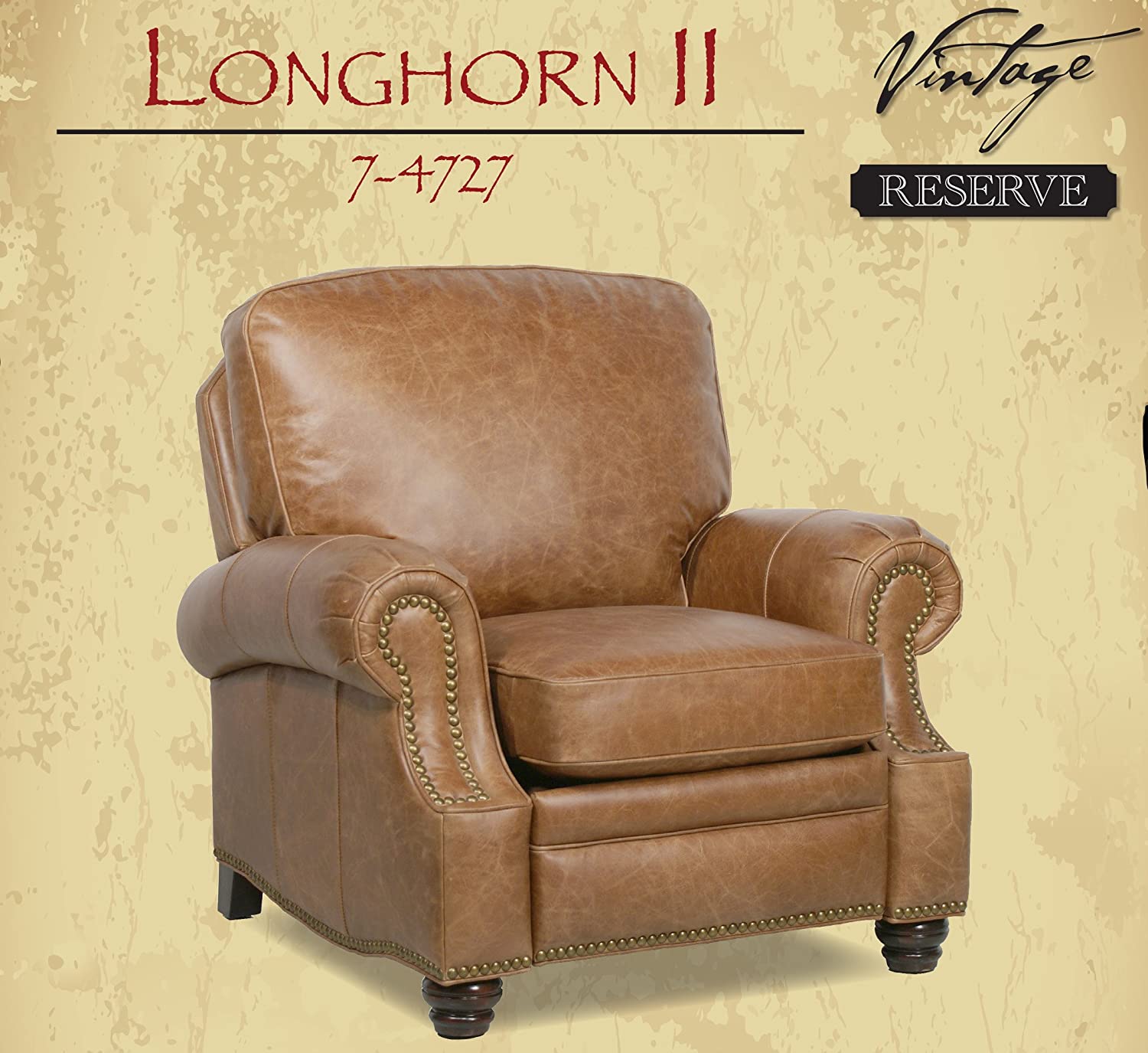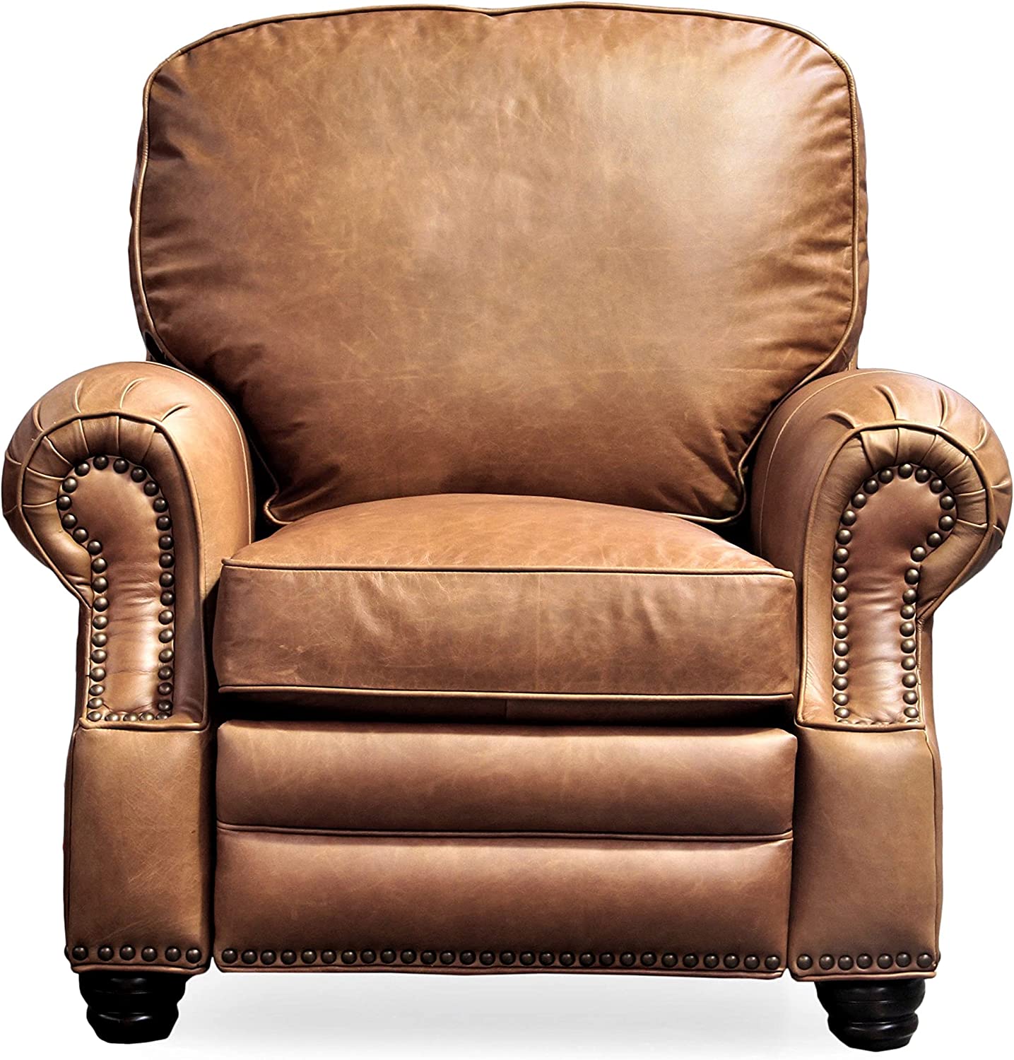 Genuine Barcalounger Longhorn II Top-Grain Leather Recliner Lounger Chair - Manual Recline Version 100% Top Grain Chaps Saddle Leather. If you desire big comfort the Longhorn II is the perfect recliner. The Solid pillow back and rolled arms deliver a classic look with decorative nail head trim and relaxing comfort. Leathers feature a distinctive design, luxurious feel and classic design. Barcalounger's Quality Construction includes: Attached Back and Seat Cushions , Hardwood plywood frames, mortise & tenon construction and glued joints & corner blocks. This helps to provide Stability, durability and longevity. Leggett & Platt mechanisms are ACTIVATED not operated. The Recliner only requires 2.5 lbs of pressure to release and push back. Mechanisms feature delrin bushings wherever metal meets metal to provides seamless motion, longevity and never squeaks. Mechanisms are attached to the frame with bolts and t-nuts to prevents screw "back-out" to increase stability and durability. 30 individual pocket coil springs, fully enclosed in fabric wrapped in foam and topped with blended down feathers 1.8 HR (high resiliency) foam. The high performance foam promotes stability, durability and longevity. Higher than average stitch count per inch, plus, reinforced seams with baseball stitch accents. This enhances seam integrity and increases aesthetic appeal. Padding all around the chair (outside arms & back). Highest quality standard in the Approximate Dimensions: 40"H x 41"W x 38"Deep. Approximate Seat Dimensions: 21"H x 22"W x 21"Deep. Arm Height is 26" Wall Proximity: 16" Approximate Weight: 110 lbs - 120 lbs Boxed